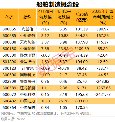 4月28日,A股船舶概念股高开后回调,中国船舶、亚星锚链盘中最高涨幅均超过9%,天海防务、中船防务盘中最高涨6%。行业龙头4月以来涨幅明显,中国船舶本月累计涨幅达到33.98%,中国动力、中船防务分别上涨25.76%、10.88%。