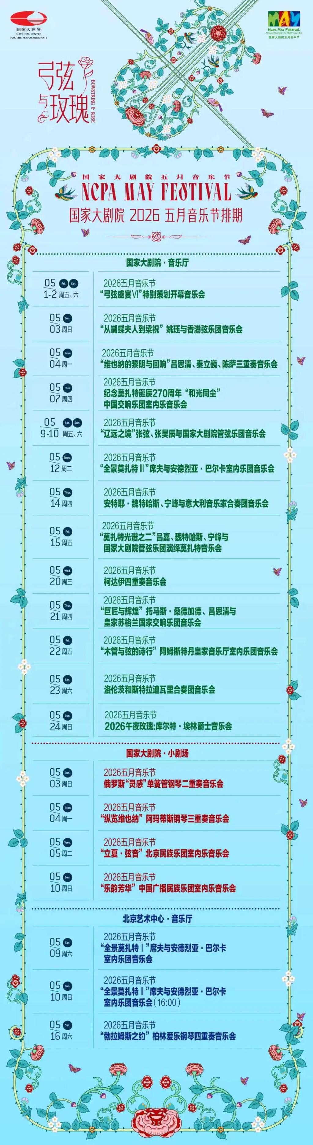 每年春天,国家大剧院五月音乐节都会呈现一次声势浩大的室内乐盛宴,今年,众多名家再来赴约。4月15日,国家大剧院正式发布2026五月音乐节演出安排,5月1日至24日,围绕“弓弦与玫瑰”的主题,23场演出将覆盖弓弦对话、经典新作、国际名团、多元室内乐的丰富形态。