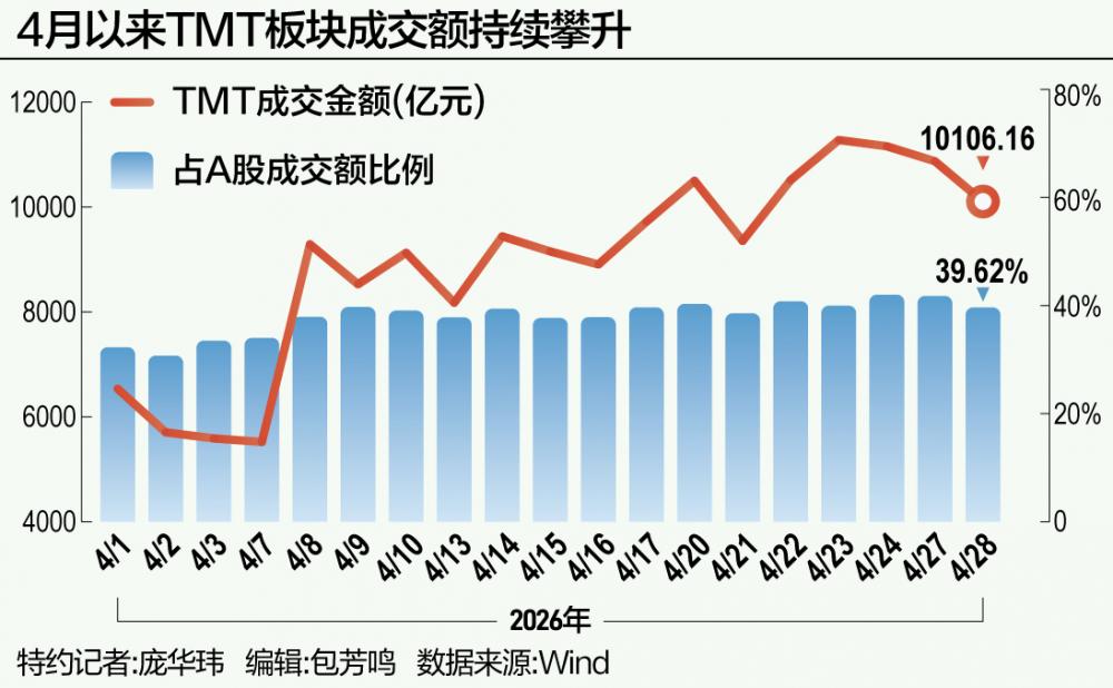 4月28日,TMT板块全天成交额1.01万亿元,占全市场总成交额2.55万亿元的39.62%。这已经是该板块连续第5个交易日成交额在万亿元以上,自4月下旬以来,TMT的成交额占比一直在40%大关上下徘徊。