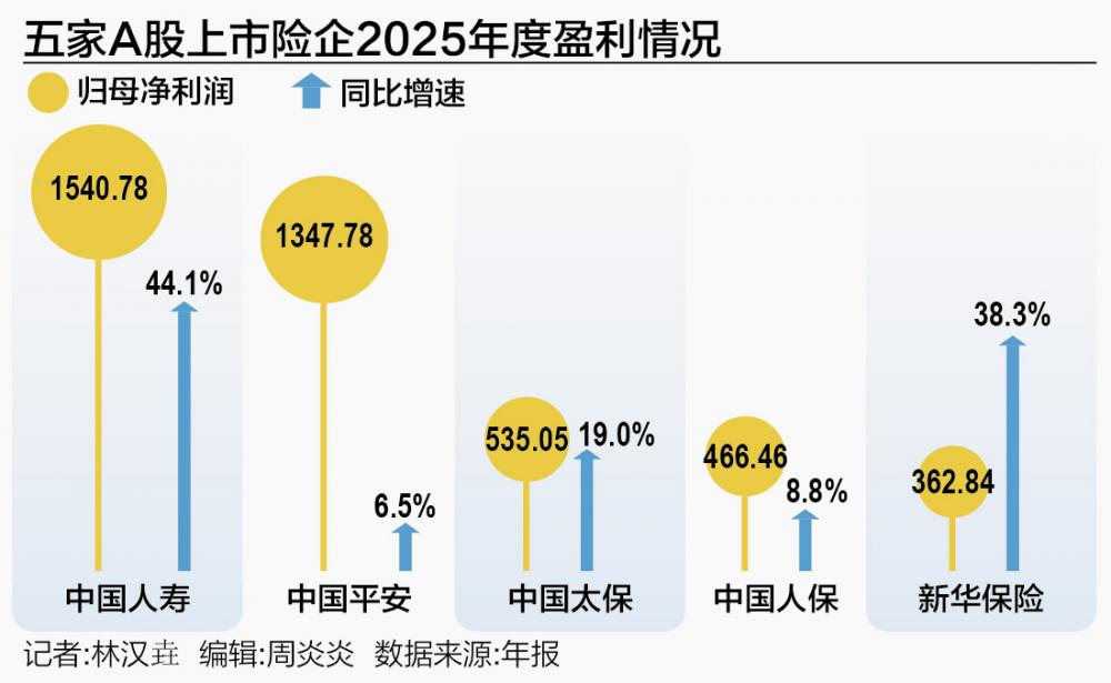 2025年,五家A股上市险企合计实现归母净利润4252.91亿元,同比增长22.4%。